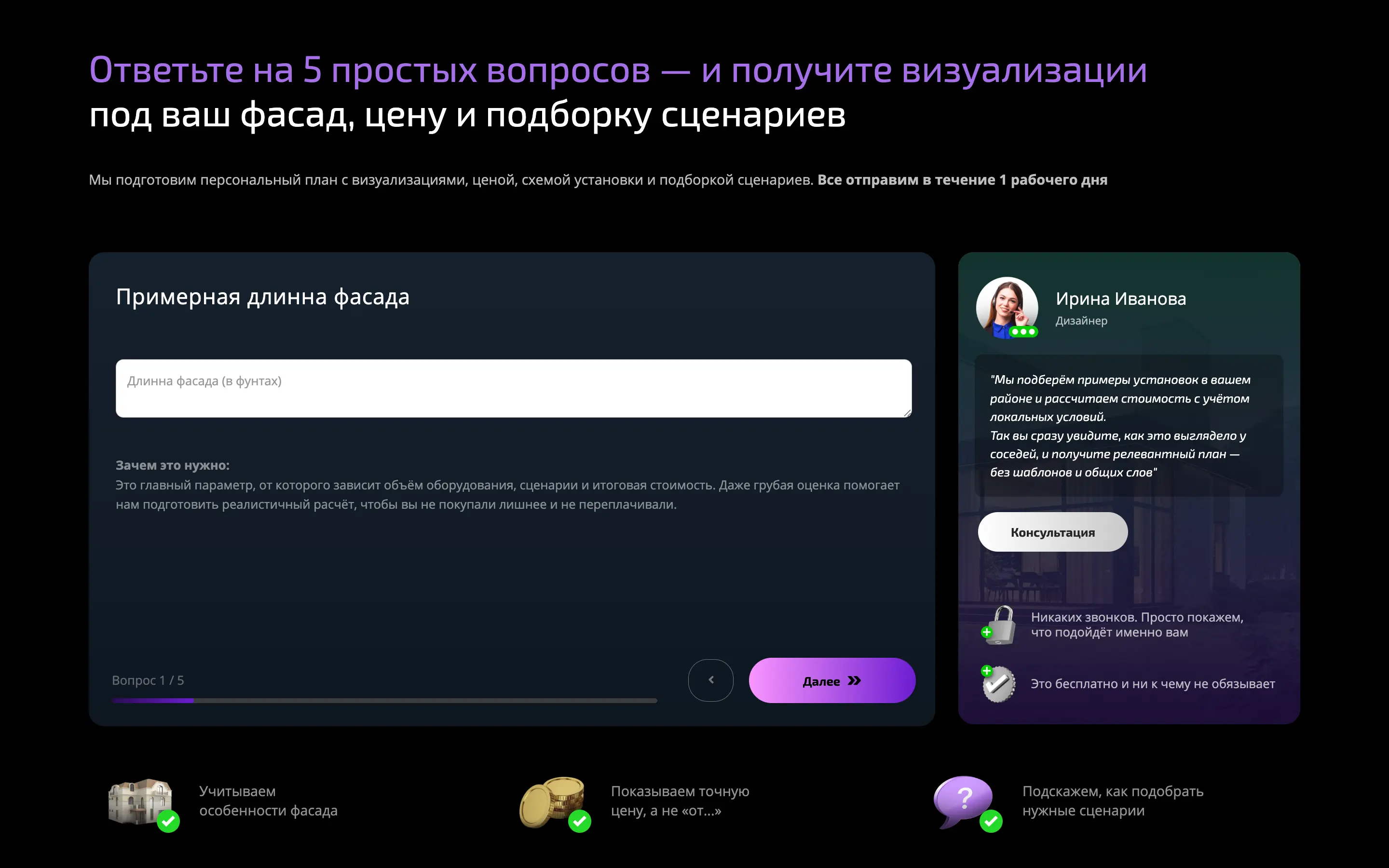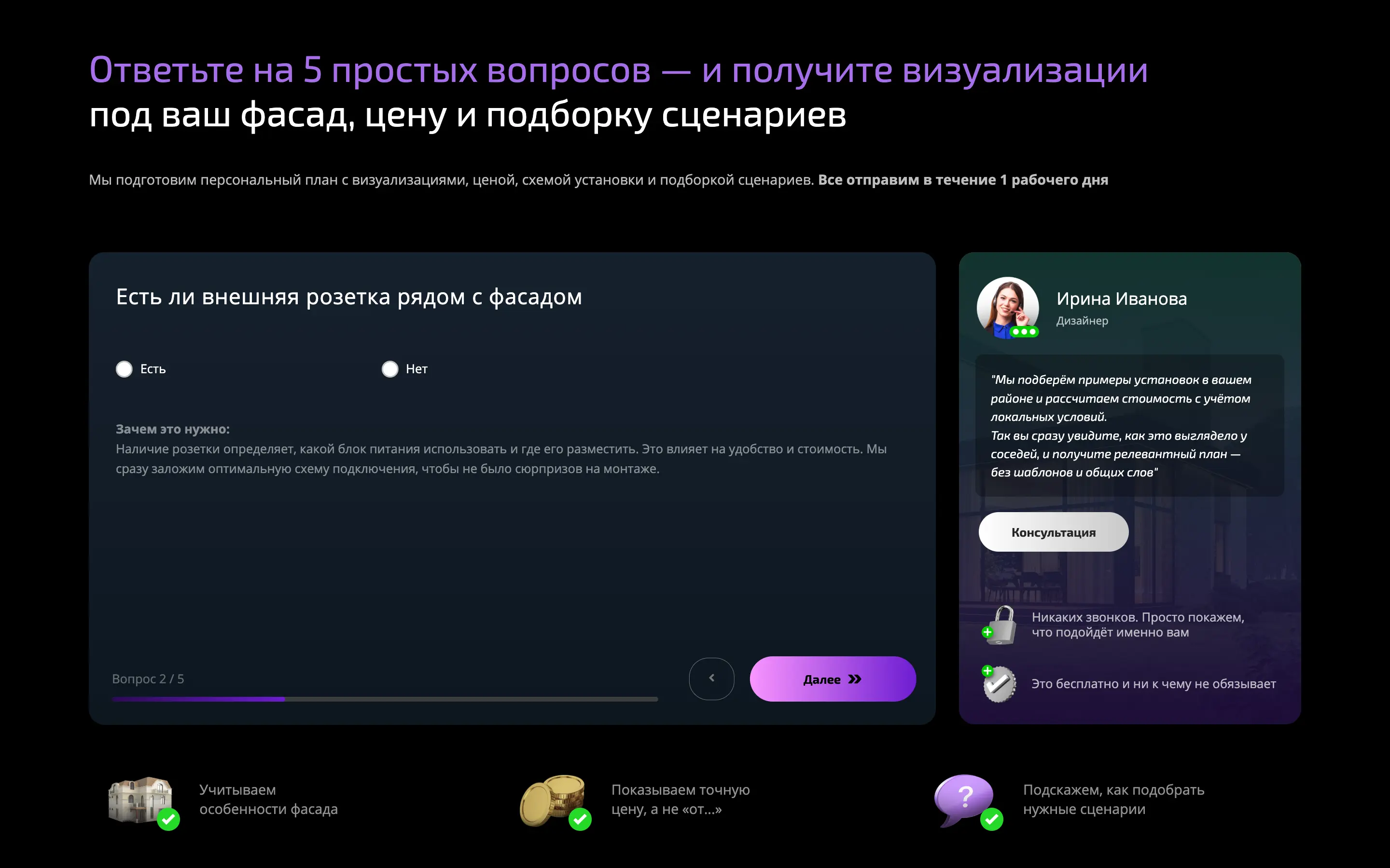 Ключевым элементом лендинга стал квиз-опрос, который помогает вовлечь посетителей сайта и повысить конверсию. Разработали квиз с понятными вопросами, связанными с типом дома, задачами освещения и пожеланиями клиента.
